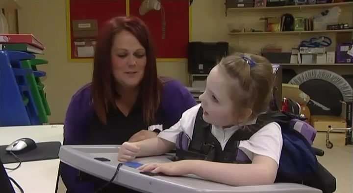 The video shows Alice pressing a switch with verbal prompting from Leanne. Pressing the switch activates a Balamory presentation